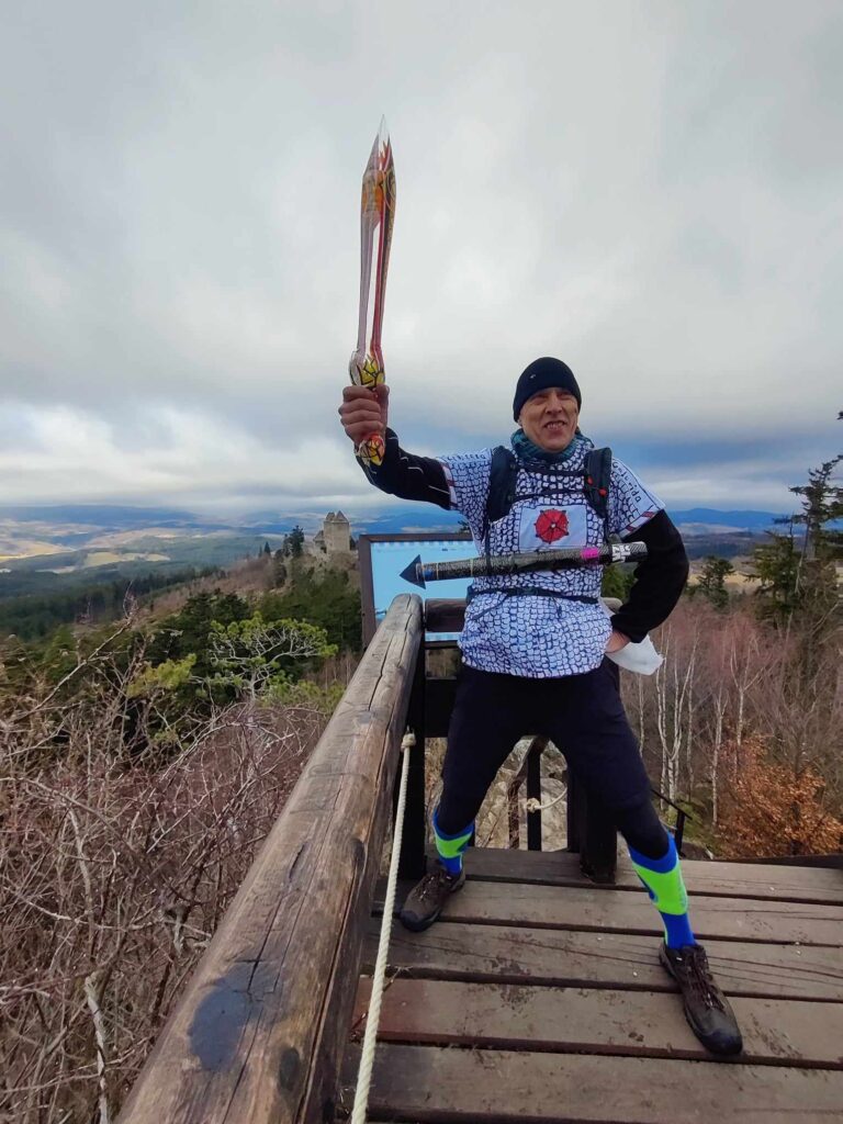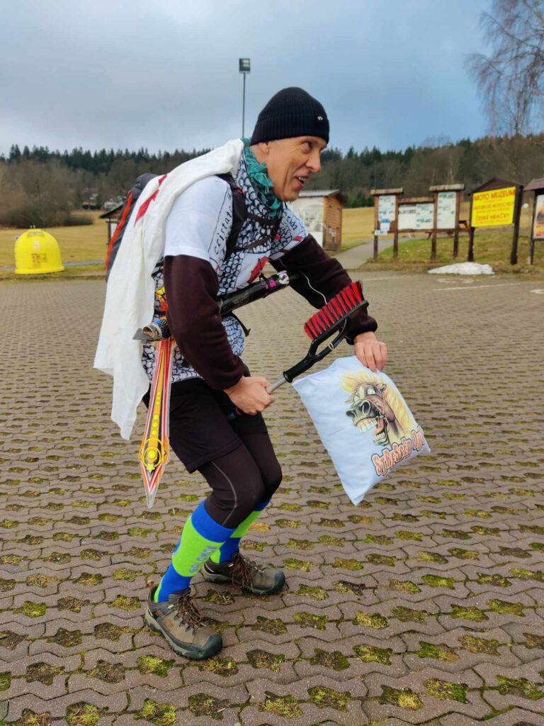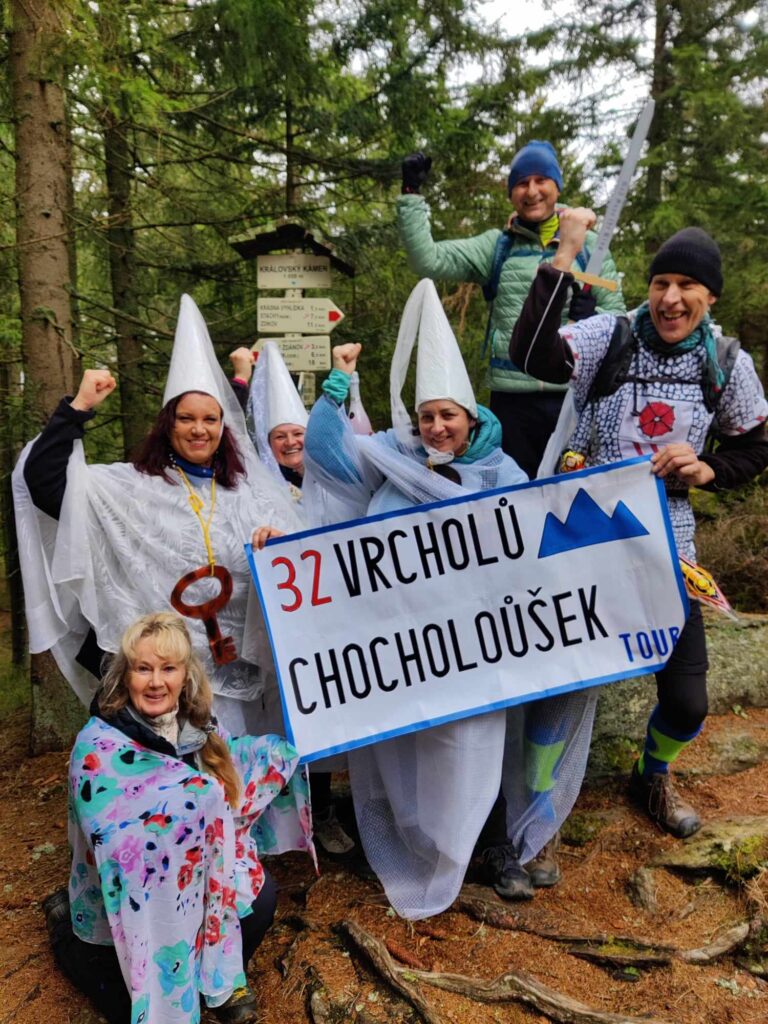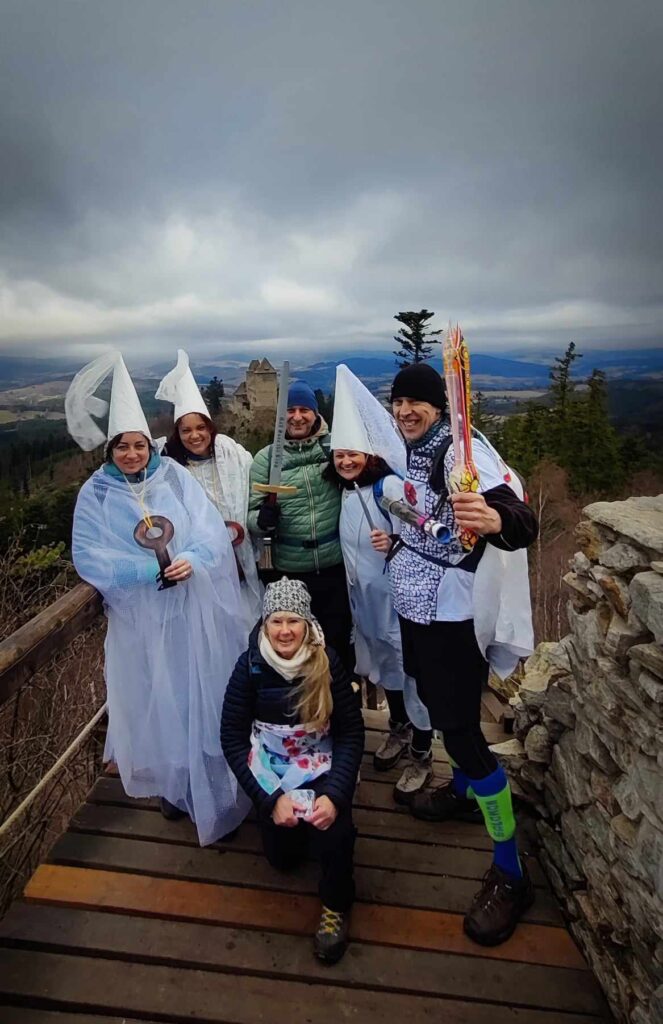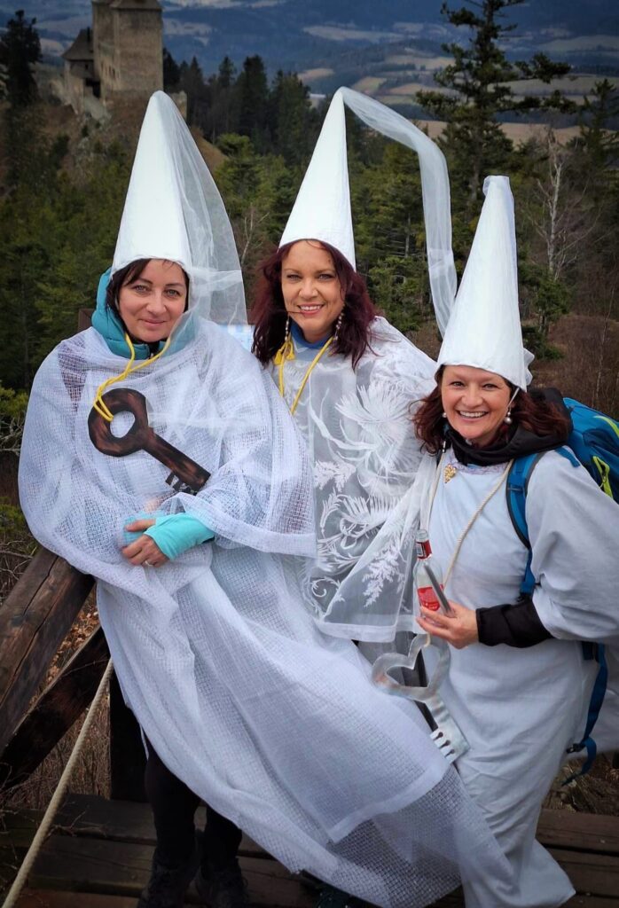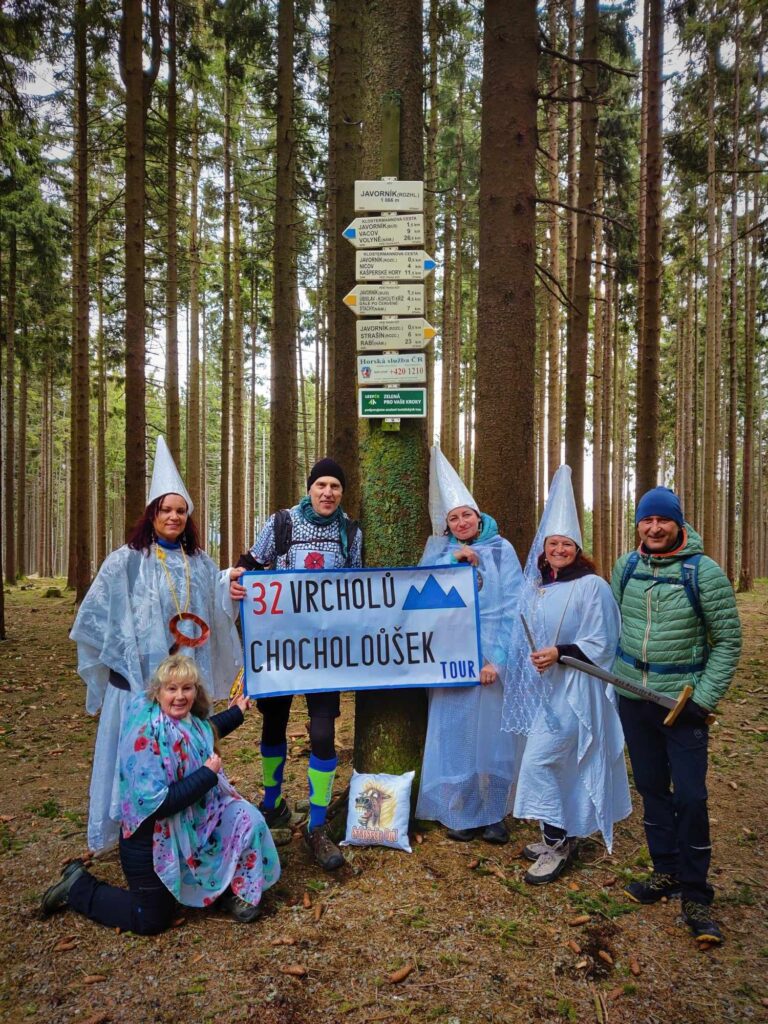 Tak tento výlet se rozjel opravdu ve velkém. A to už ve chvíli, kdy PET před Kauflandem stála omotaná asi 10-ti metry záclon. První společná fotografie bílých paní vznikla již u benzinové pumpy “U stopařky”. Na parkovišti pod Kašperkem jsme vše doladili, nasadili čepce, závoje, SLA osedlal svého oře, kterého připevnil na škrabku na led, nafoukl meč a mohli jsme vyrazit. Celých 28 kilometrů jsme urazili v těchto úborech. Někteří nás sice obešli obloukem, jiní se s námi fotili a někteří dokonce do kasičky hodili pár drobných, aby si s námi tu společnou fotografii mohli pořídit.