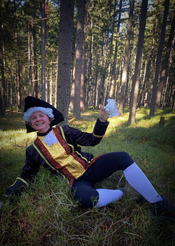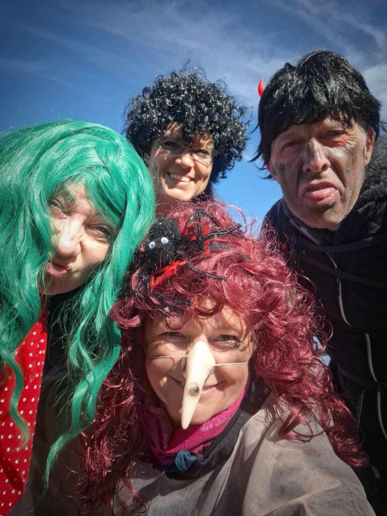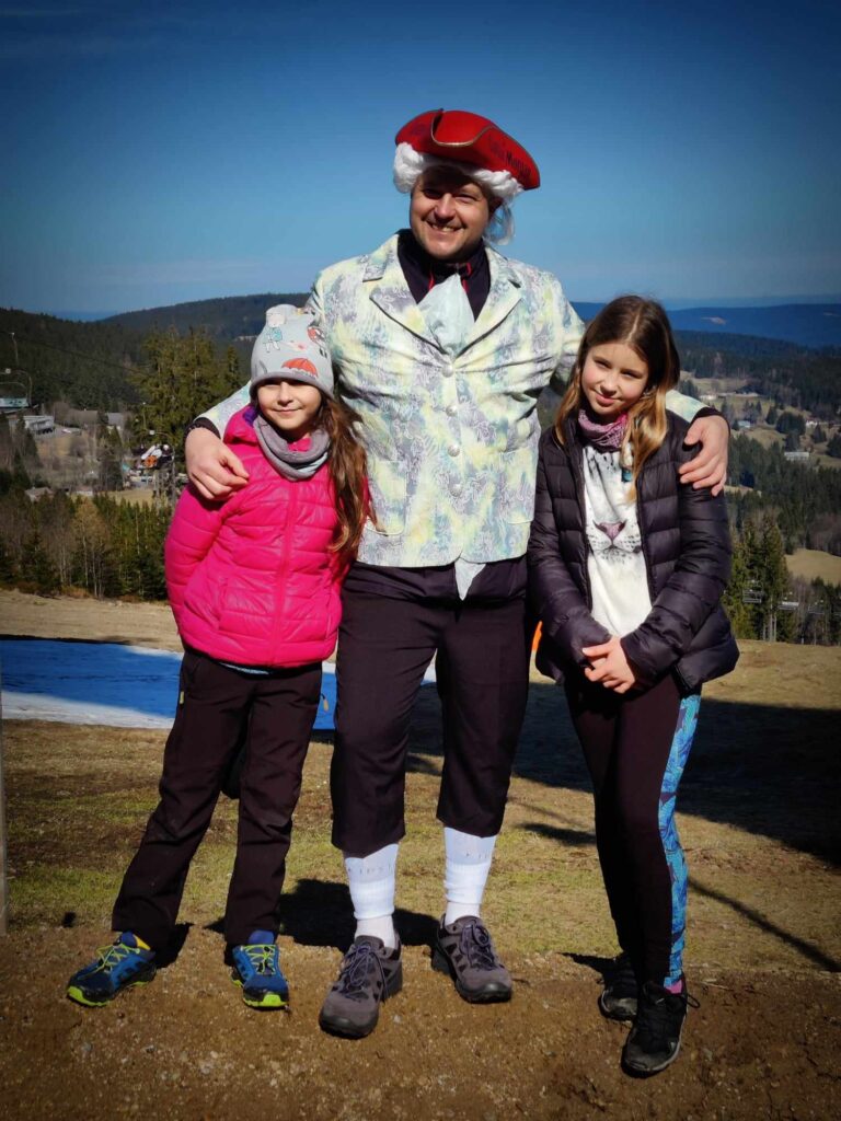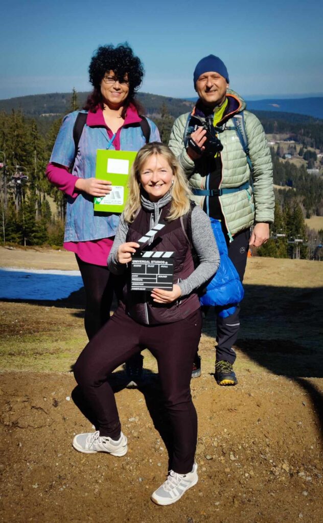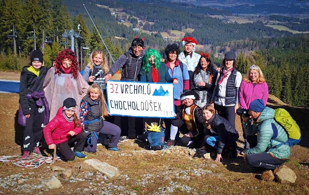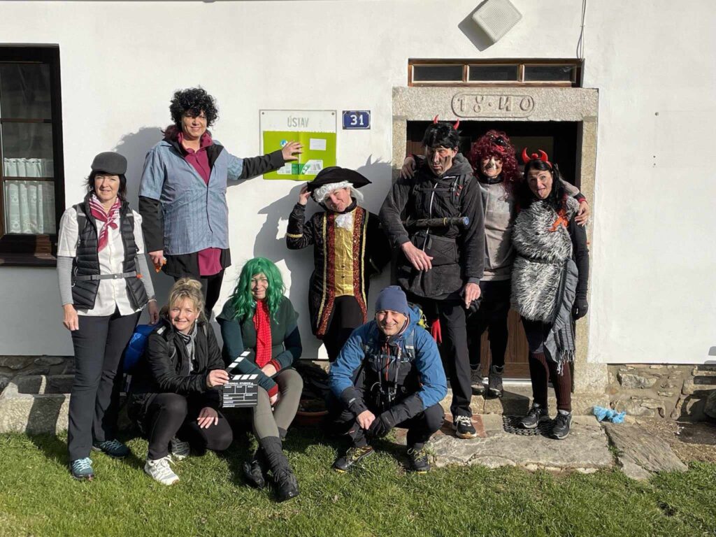 Kousek od rozhledny potkáváme protijdoucí zevlouny a doteďka mi v hlavě rezonuje věta ,kterou pronesli při míjení Elišky….asi carevna. Barbaři, nerozumí kumštu, nejspíš Pražáci. Po tomto malém fopa přicházíme k rozhledně a podruhé potkáváme knížepána. A poprvé též pana Jandu. Následuje výstup na rozhlednu, zdařile kamuflovanou jako skokanský můstek. Tento výstup k oblakům nese dost nelibě hlavně rejža. Jsem netušil, že je tak přízemní. Ale nakonec to taky dá. Následují krásné výhledy, nezbytné focení s chochotransparentem a lehký catering. Ten catering nebyl špatný nápad a proto vyrážíme na nějaký ten pamlsek do blízké cukrárny Ella. Při příchodu do cukrárny vidíme zvědavé pohledy ostatním hostů. Kdy se taky poštěstí vidět tolik hereckých celebrit na jednom šumavském kopci. Snad jen ostych jim zabránil požádat o nějaký ten autogram. Takže autogram nebo ne, nějaká ta kávička, sendvič a dortík přijdou vhod. Po chvilkovém relaxu nadešel čas na foto v chochosociální bublině. A v tom nás podruhé míjí pan Janda. Ne naposled. Balíme. loučíme se s knížetem MICH a vyrážíme směr Pucherský mlýn. Následuje sestup pod lanovkou a pak posléze kus lesem . Zde objeví ježibaba HAM krásnou lesní chýší a mě, čili čerta SLA na nějaké ty techtle mechtle. No nešlo odolat, už jen v zájmu kinematografie. Pokračujeme dále v sestupu a potřetí a naposled potkáváme pana Jandu s přítelkyní. A poté, když už je všem Jandům konec, konečně dorážíme k mlýnu. Cesta věru strastiplná přes potok vedoucí. Ten zdoláme po spadlém stromu, který tam jistě nepřítomný mlynář připravil. Z mlýna zbyly jen malebné ruiny takže opět nějaká ta fotka a DAV záběr.