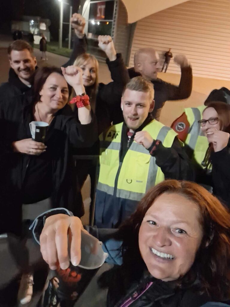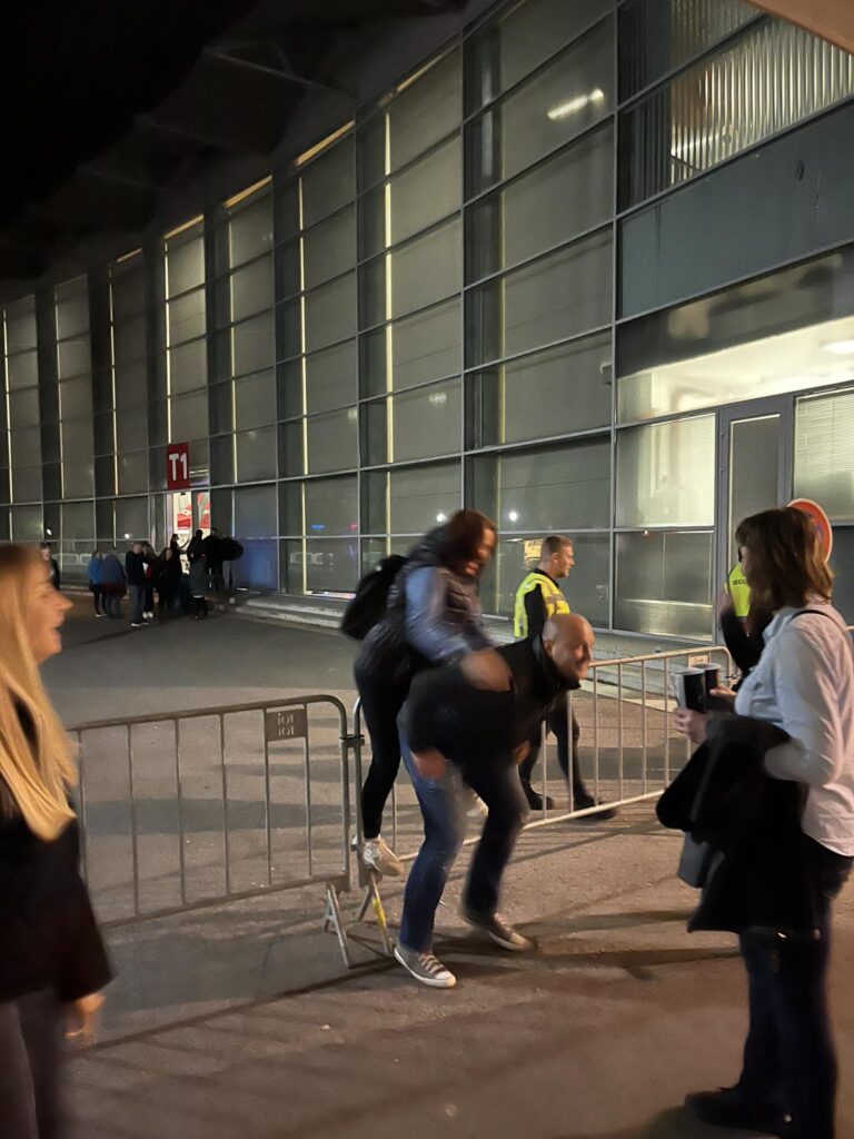 Kapela dohrává, k návratu nepomohlo ani bouřlivé skandování fanoušků a pak se také chystáme opustit halu. Jenže – je třeba si dojít ještě odskočit – dámské toalety přeplněné x pánské – relativně volné, volíme tedy rychlejší variantu pánských záchodů (překvapení, kterého se HAM dostalo ve dveřích pánských záchodů bylo tak šokující, že si následně zasloužilo panáka). Když už jsme se zdárně sešli venku – vzpomněli si na výzvu fotky s tučňákama (asi těm tučňákům bylo zle – protože nebyli černí, ale zelení). Proběhlo foto (jeden tučňák se tedy trochu bránil, ale když vedoucí dovolila, vyfotil se s náma taky). HAM si potřebovala vyzvednout kolo za zátarasy, KAC si vzpomněla na své atletické mládí a zátaras přeskočila – bohužel špatně došlápla a máme z toho další „Chochoúraz“ … ☹.