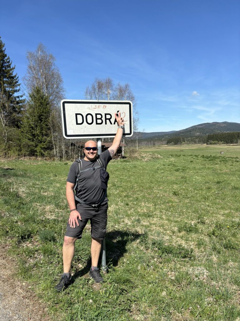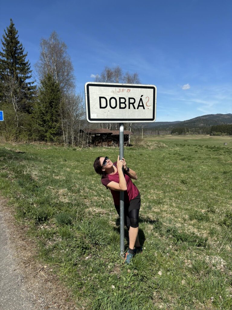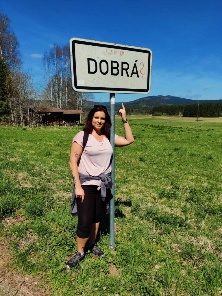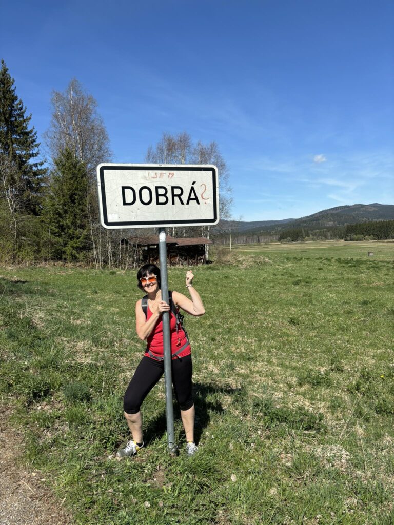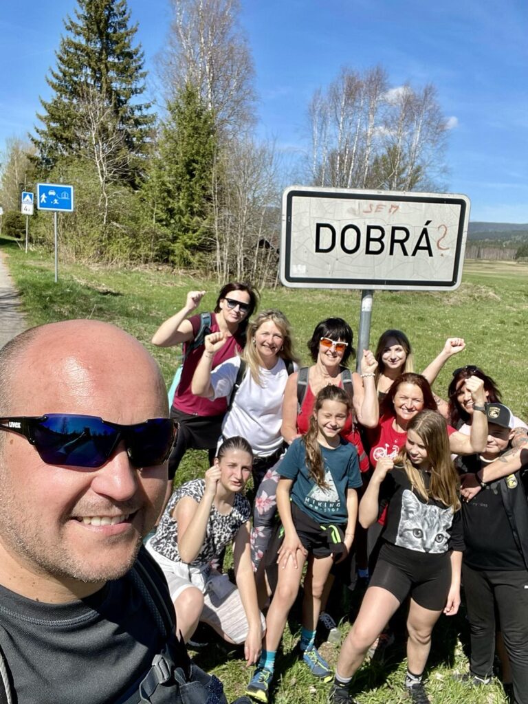Procházkou docházíme do vesnice Dobrá, u jejíž cedule, která byla vyzdobena místním umělcem, pózujeme nejdřív každý sólo, následně hromadně. Dá se říct, že jsme již skoro v cíli cesty, což nejvíce oceňuje naše omladina a míříme do místní hospůdky na něco dobrého k jídlu. V nabídce toho mají hodně, jak zjišťujeme vyvoláváním paní z okénka „tlačenka Hanka“, „bramborák Petra“, „polévka Hanka, Alča“. Myslím, že některé názvy se určitě uchytí. Po výborném jídle se pomalou chůzí dojde k autu a následuje přesun na další vrchol výzvy Soumarský most. Je to pár minutek jízdy, po zaparkování hledáme ideální místo ke koupání. Převléct se do plavek, stejného outfitu všech členů chocho je otázkou pár minut a šup jsme v řece. Po příjemném osvěžení jdeme na jedno pivo, tedy neřidiči a řidiči na nealko. HAV nás upozorní, že se hraje hokej, a tak ihned zapíná přímý přenos a většina s napětím sleduje napínavé utkání na ledě.