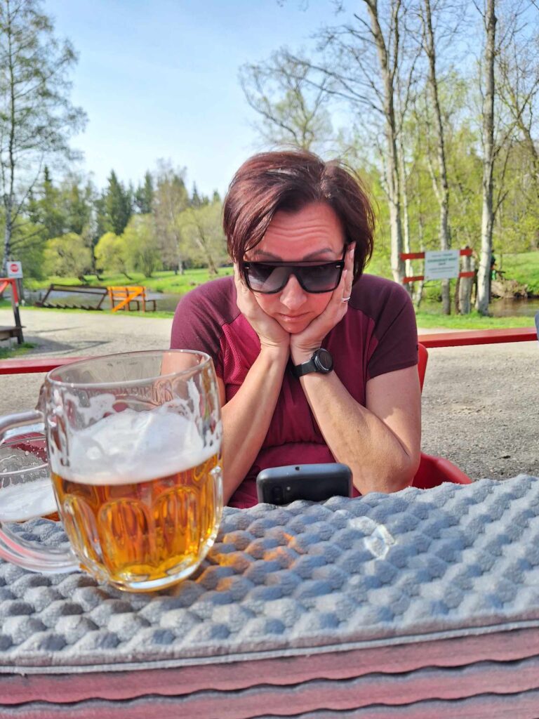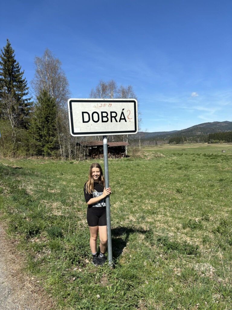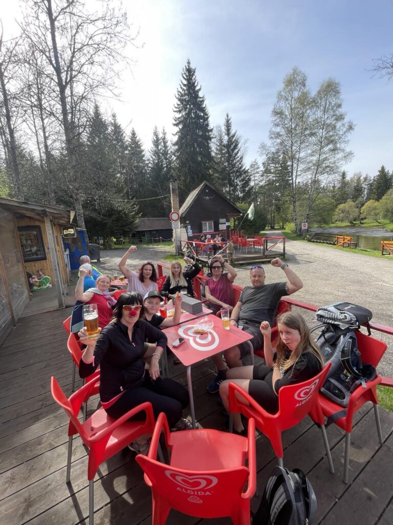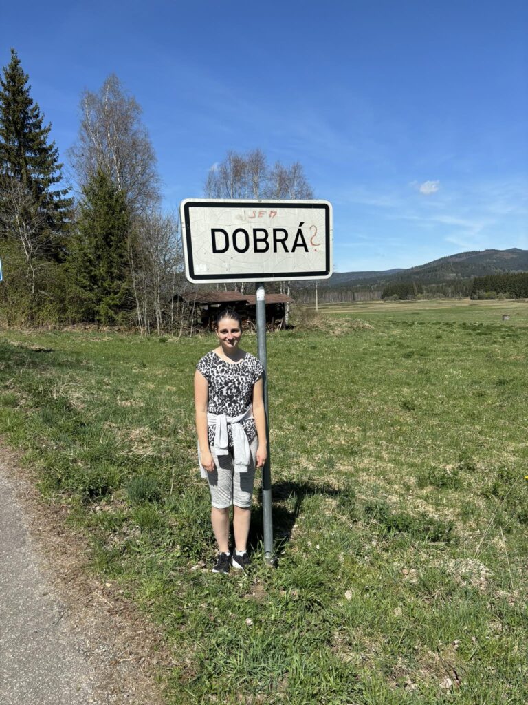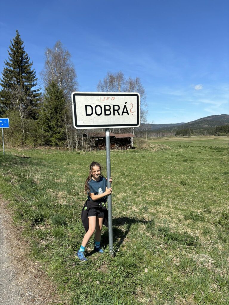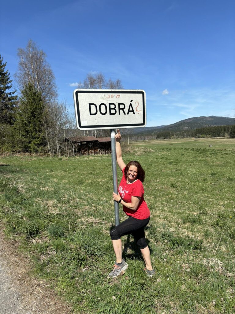 Procházkou docházíme do vesnice Dobrá, u jejíž cedule, která byla vyzdobena místním umělcem, pózujeme nejdřív každý sólo, následně hromadně. Dá se říct, že jsme již skoro v cíli cesty, což nejvíce oceňuje naše omladina a míříme do místní hospůdky na něco dobrého k jídlu. V nabídce toho mají hodně, jak zjišťujeme vyvoláváním paní z okénka „tlačenka Hanka“, „bramborák Petra“, „polévka Hanka, Alča“. Myslím, že některé názvy se určitě uchytí. Po výborném jídle se pomalou chůzí dojde k autu a následuje přesun na další vrchol výzvy Soumarský most. Je to pár minutek jízdy, po zaparkování hledáme ideální místo ke koupání. Převléct se do plavek, stejného outfitu všech členů chocho je otázkou pár minut a šup jsme v řece. Po příjemném osvěžení jdeme na jedno pivo, tedy neřidiči a řidiči na nealko. HAV nás upozorní, že se hraje hokej, a tak ihned zapíná přímý přenos a většina s napětím sleduje napínavé utkání na ledě.
