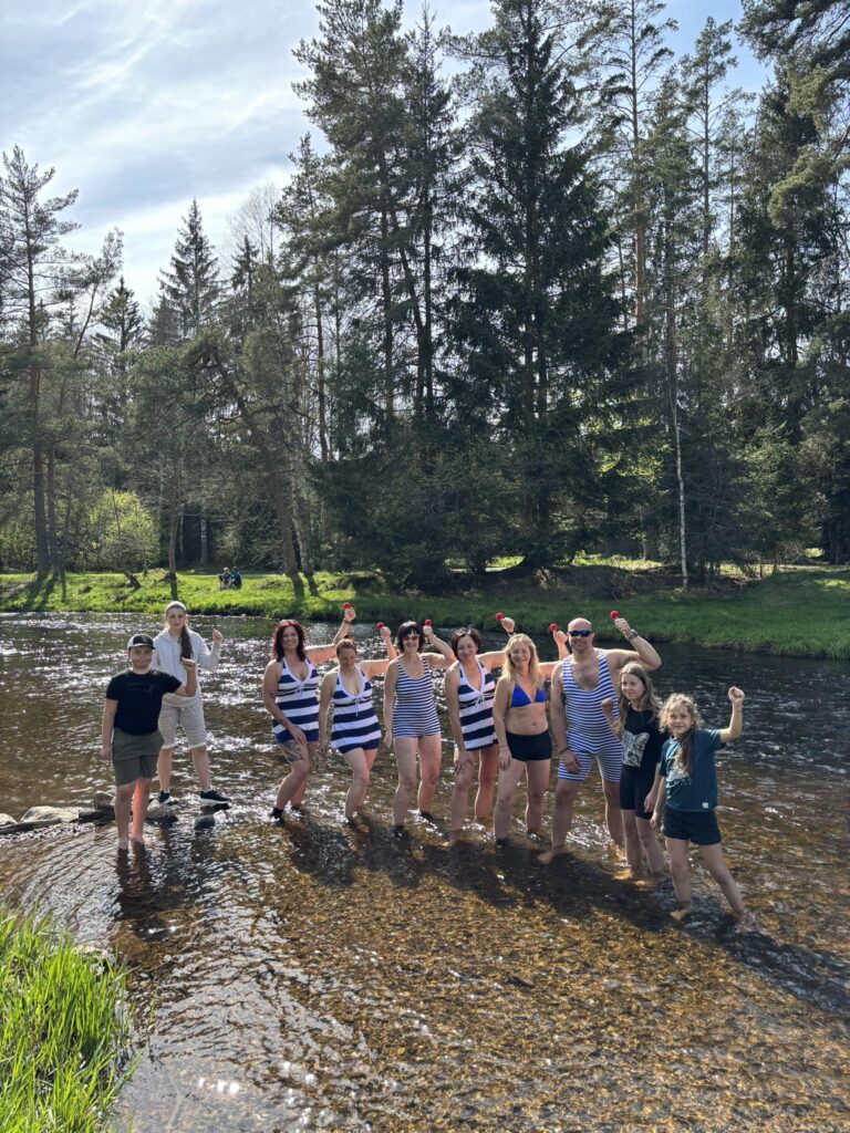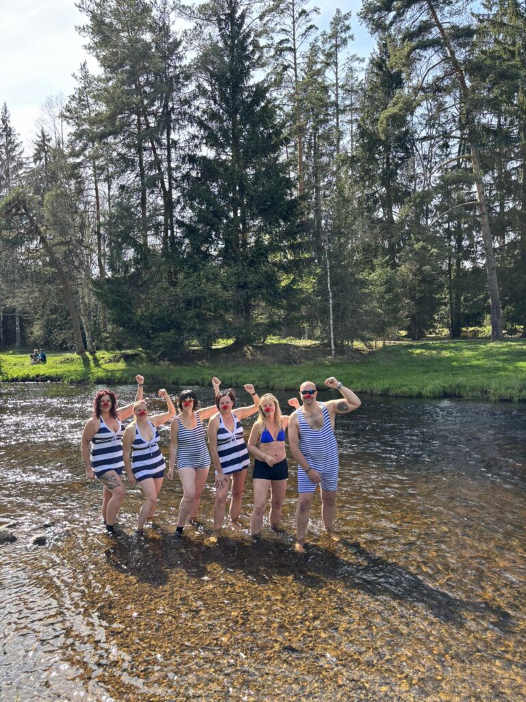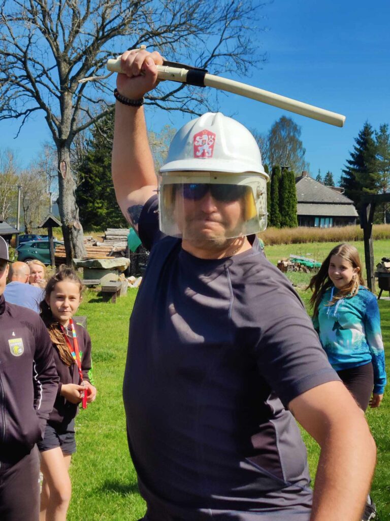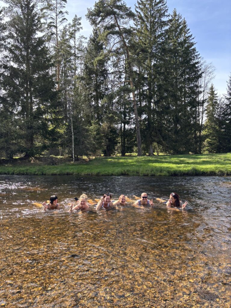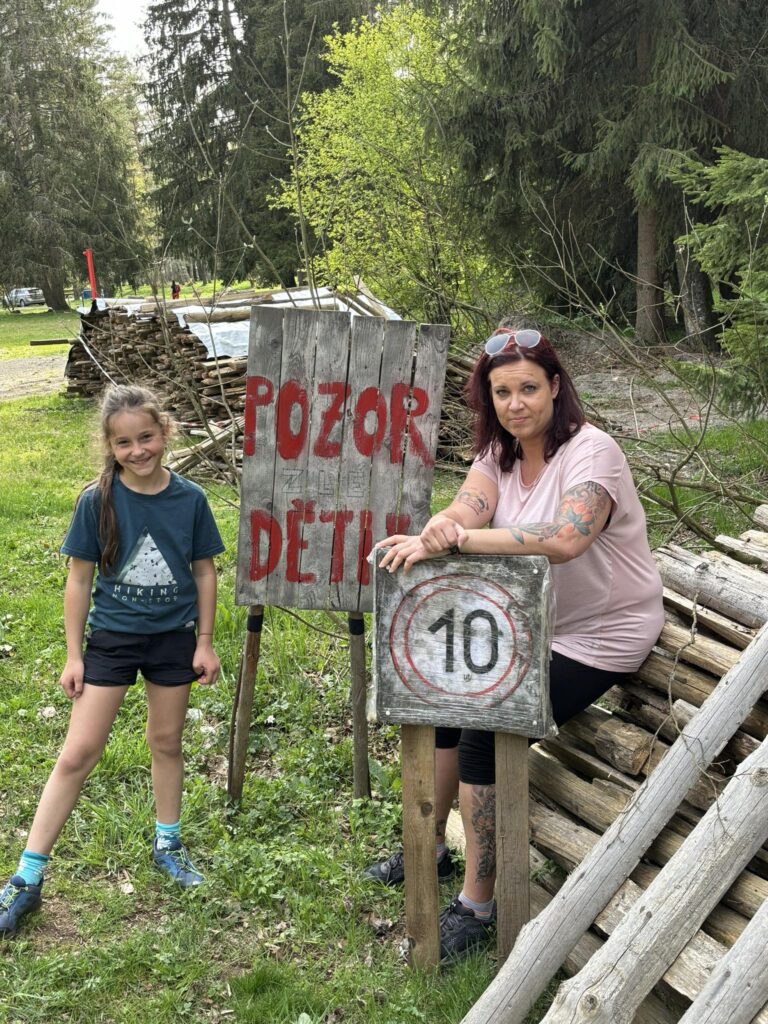 Procházkou docházíme do vesnice Dobrá, u jejíž cedule, která byla vyzdobena místním umělcem, pózujeme nejdřív každý sólo, následně hromadně. Dá se říct, že jsme již skoro v cíli cesty, což nejvíce oceňuje naše omladina a míříme do místní hospůdky na něco dobrého k jídlu. V nabídce toho mají hodně, jak zjišťujeme vyvoláváním paní z okénka „tlačenka Hanka“, „bramborák Petra“, „polévka Hanka, Alča“. Myslím, že některé názvy se určitě uchytí. Po výborném jídle se pomalou chůzí dojde k autu a následuje přesun na další vrchol výzvy Soumarský most. Je to pár minutek jízdy, po zaparkování hledáme ideální místo ke koupání. Převléct se do plavek, stejného outfitu všech členů chocho je otázkou pár minut a šup jsme v řece. Po příjemném osvěžení jdeme na jedno pivo, tedy neřidiči a řidiči na nealko. HAV nás upozorní, že se hraje hokej, a tak ihned zapíná přímý přenos a většina s napětím sleduje napínavé utkání na ledě.