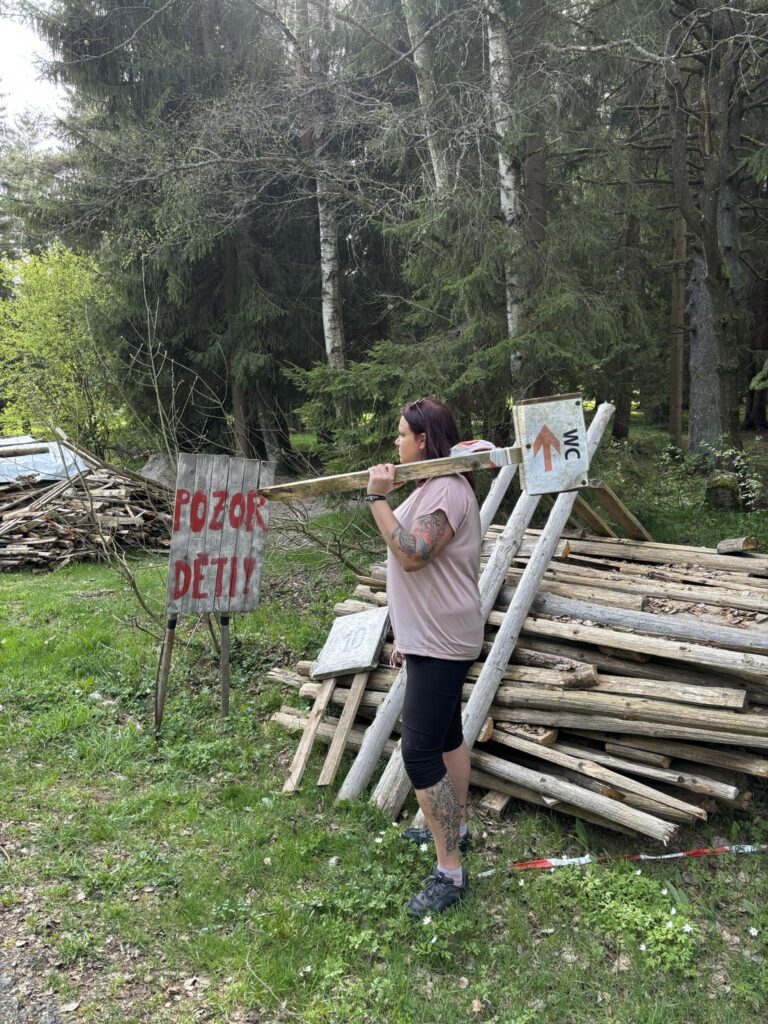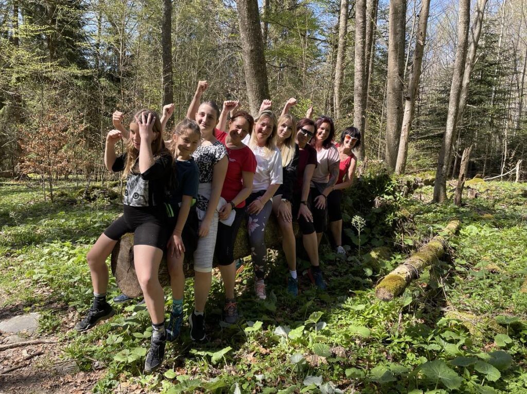 Cesta ke kapli nám ubíhá svižně, povídáme, plánujeme další výzvy a akce, děti počítají na křížové cestě dřevěné cedule, dostávají doplňující otázky na body, za které budou na konci vyhodnoceny. Po dlouhém stoupání docházíme k zátarasu v podobě bíločervené pásky zakazující vstup na stezku shora z důvodu hnízdění místního ptactva. Jako myšky procházíme přes zakázaný koridor a za 5 min jsme u kaple. Cca 5 min po nás přichází ze správného směru „lesapán“ a ženské osazenstvo týmu ohodnocuje jeho mužské kvality. Telefonní číslo pán nedá, je ženatý, jak bylo zjištěno vysláním syna PET v rámci bodové výzvy, i když body jako motivace nezapůsobily a rozhodl se splnit úkol až po uplacení od KAC za 100 Kč. Nutno podotknout, že úkol splnil a finanční odměnu si zasloužil. Po občerstvení v podobě jellybeans (oficiálně první uznané chochojídlo, které již nesmí chybět na žádném výletu a je vítáno všemi věkovými kategoriemi) a doplnění nezbytných tekutin pomalu vycházíme a užíváme si krás přírody kolem nás. V polovině cesty uvidíme správně dlouhý poražený strom, na který se ženy usazují a předvádí slepičky na bidýlku na počest DAV, který se bohužel dnešního výletu zúčastnit nemohl. Čehož určitě hodně lituje, protože tyto vrcholy byly pojaty civilně, a tedy nebyl nutný žádný převlek.